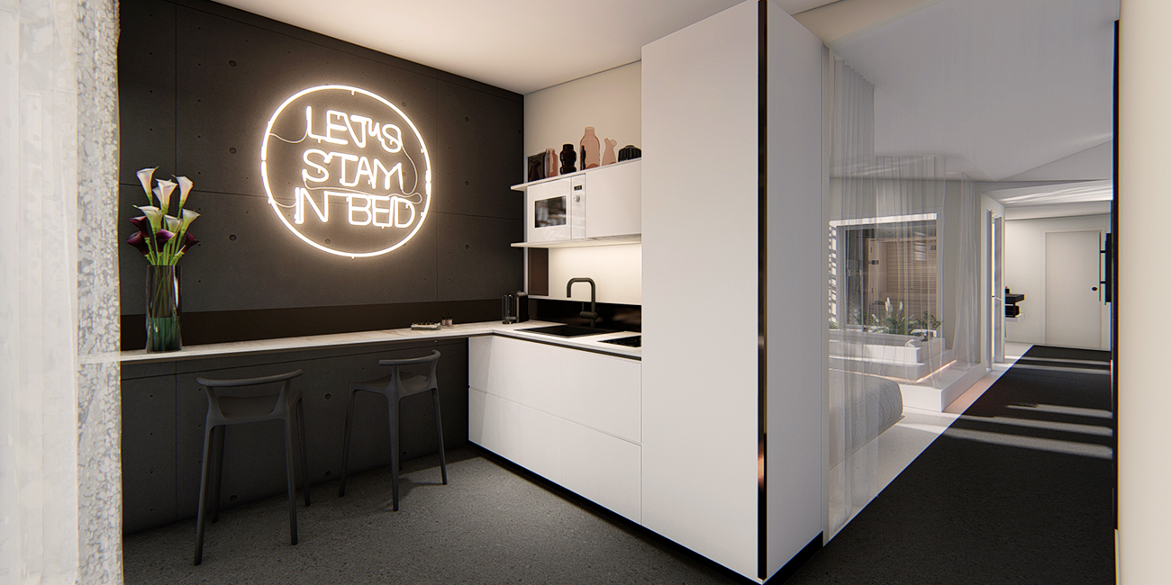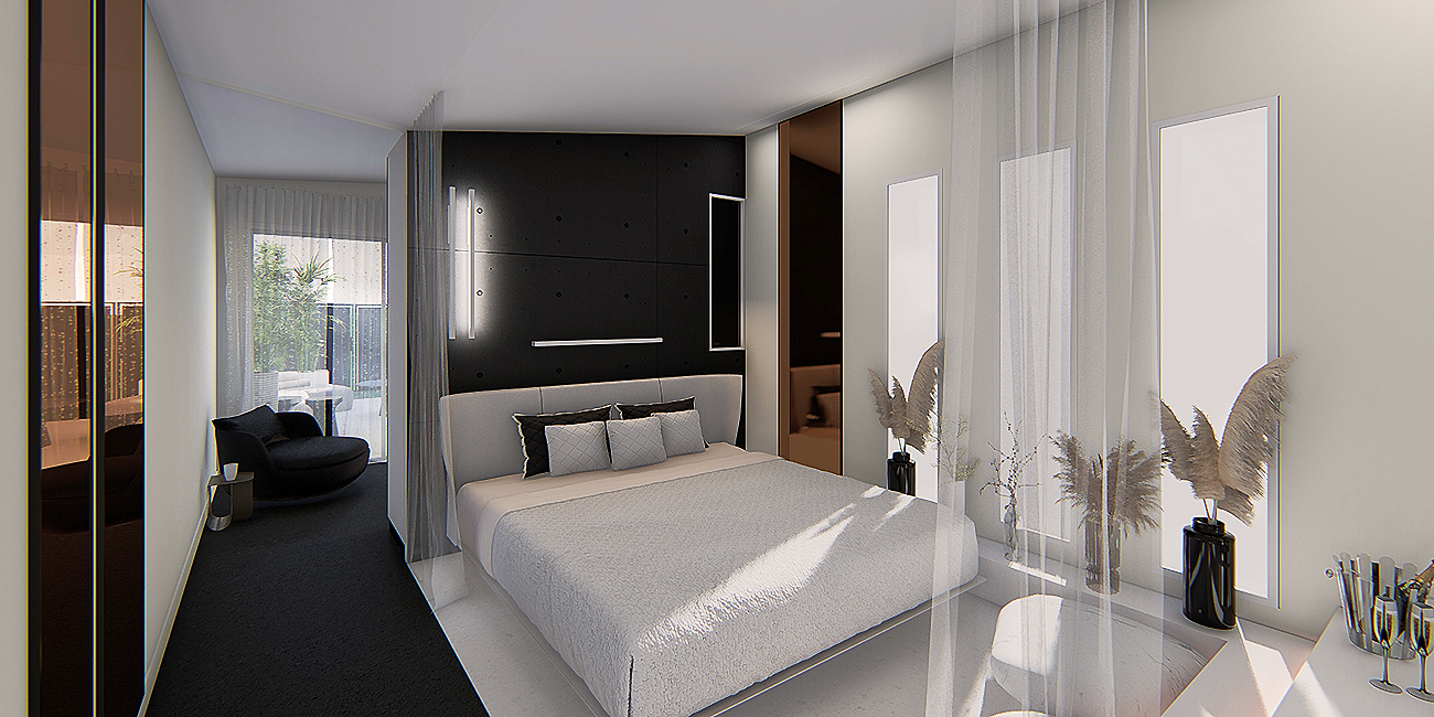 Ce projet consiste en l’aménagement d’un volume en une love room élégante, idéale pour la location de courte durée. L’aménagement combine raffinement, confort et élégance.