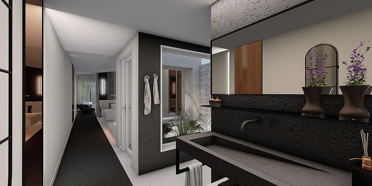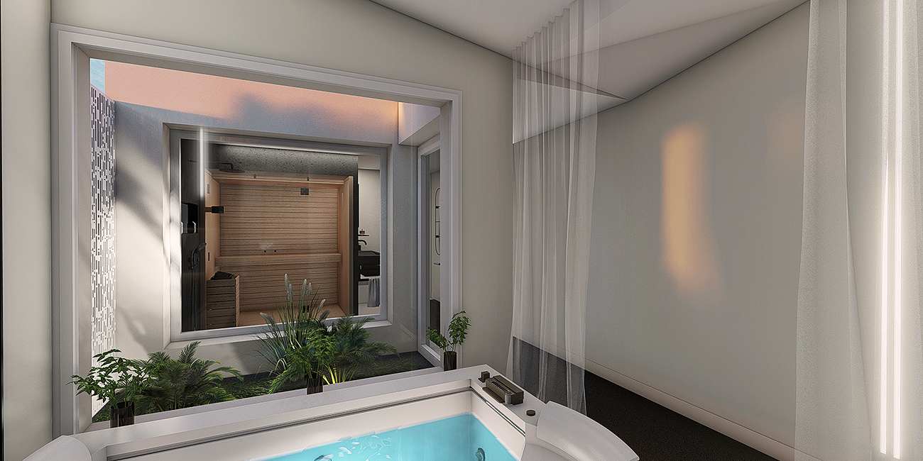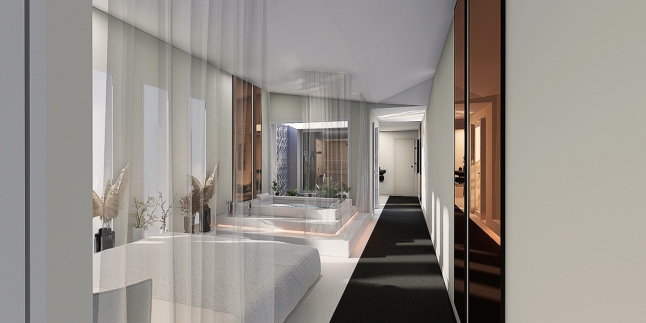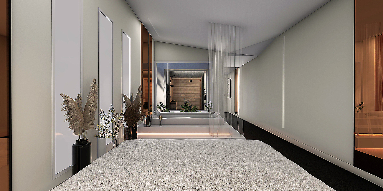 L’espace est optimisé pour offrir une atmosphère intime et fluide, avec des agencements modernes et multifonctionnels. L’éclairage tamisé et ajustable crée une ambiance romantique, tandis que des équipements haut de gamme, tels qu’une baignoire design et des espaces de détente, garantissent un séjour confortable.